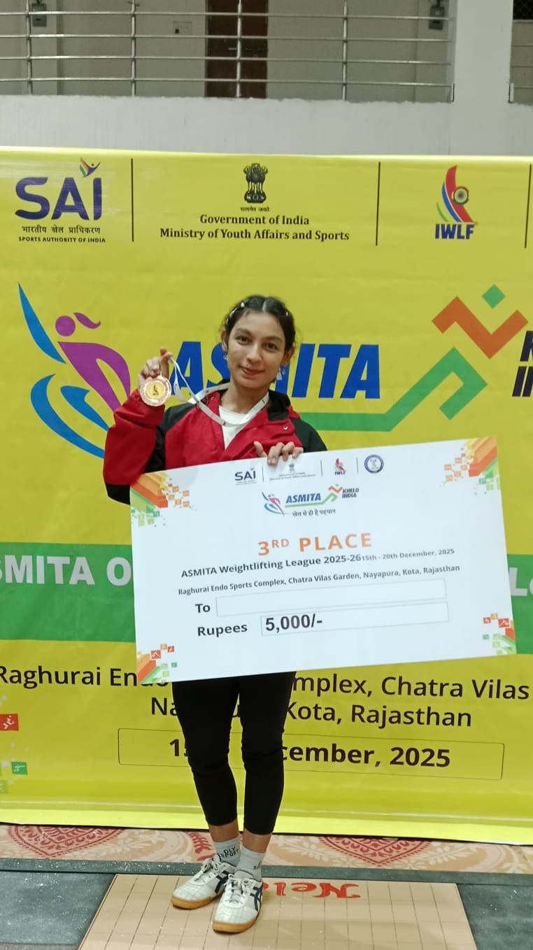 महासमुंद – इंडियन वेटलिफ्टिंग फेडरेशन द्वारा अस्मिता खेलों इंडिया महिला वेस्टजोन भारोत्तोलन लीग प्रतियोगिता का आयोजन दिनांक 15 से 19 दिसंबर 2025 तक स्पोर्टस कॉम्प्लेक्स नयापुरा कोटा, राजस्थान में आयोजित किया गया, जिसमें छत्तीसगढ़ राज्य की बालिका यूथ टीम शामिल होने 13 दिसम्बर को राजस्थान रवाना हुई थी। बागबाहरा जिला महासमुंद की किरण बघेल ने राज्य स्तरीय प्रतियोगिता 13 जुलाई को पाटन जिला दुर्ग में आयोजित किया गया था, जिसमें स्वर्ण पदक जीतने में सफलता हासिल कर राष्ट्रीय प्रतियोगिता के लिए चयनित हुई थीं। किरण ने राष्ट्रीय प्रतियोगिता राजस्थान में बेहतर प्रदर्शन करते हुए कांस्य पदक जीतने में सफलता हासिल किया। समापन समारोह में अतिथियों ने मेडल एवं 5000 रु. चेक राशि प्रदाय कर किरण को पुरस्कृत किया। प्रदेश भारोत्तोलन संघ, जिला संघ के पदाधिकारियों एवं जिले के खिलाड़ियों ने हर्ष व्यक्त किया है। राष्ट्रीय वेटलिफ्टिंग चैंपियनशिप में किरण बघेल के कांस्य पदक जीतने एवं उपलब्धि हासिल करने पर जिला वेटलिफ्टिंग संघ अध्यक्ष खिलावन बघेल, खेल अधिकारी खेल एवं युवा कल्याण महासमुंद मनोज धृतलहरे, जिला संघ सचिव गणेश कोसरे, टीम प्रशिक्षक सुमित बघेल, हिरेंद्र देवांगन, डॉ. सेवन दास मानिकपुरी, हिरेंद्र साहू, नीलम सिंहा, इंद्राणी भास्कर, रामेश्वरी दीवान, अंजनी साहू इत्यादि ने बधाई दीं।