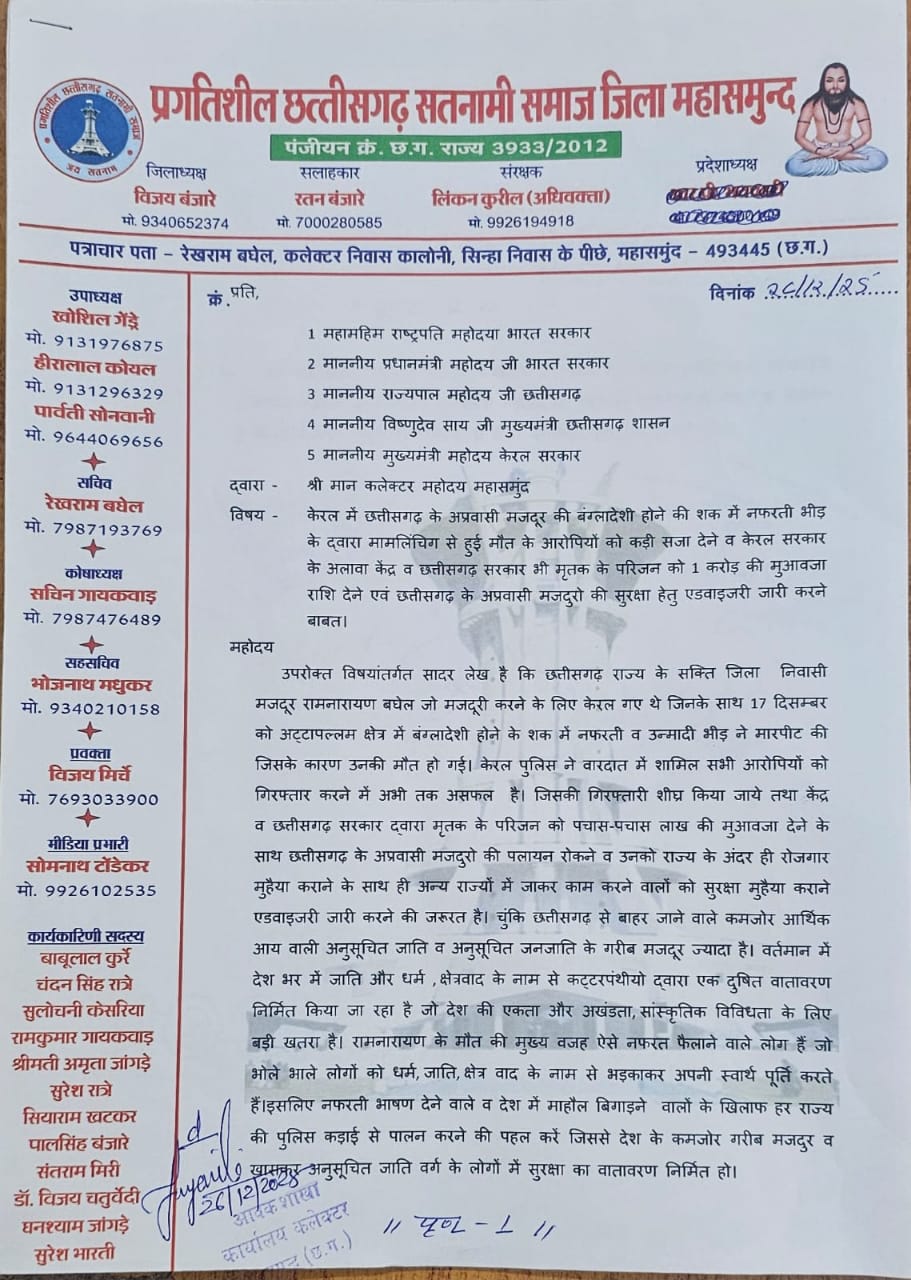 महासमुंद – छत्तीसगढ़ के मजदूर की केरल में मामलिंचिग से हुई मौत पर प्रगतिशील छत्तीसगढ़ सतनामी समाज ने राष्ट्रपति, प्रधानमंत्री, छत्तीसगढ़ के राज्यपाल, मुख्यमंत्री विष्णुदेव साय के साथ ही केरल के मुख्यमंत्री के नाम से डिप्टी कलेक्टर महासमुंद को ज्ञापन सौंपकर मृतक के परिजन को एक करोड़ की मुआवजा व पलायन रोकने के साथ ही बाहरी राज्यों में काम कर रहे मजदूरों की सुरक्षा हेतु एडवाइजरी जारी करने की मांग किया गया।