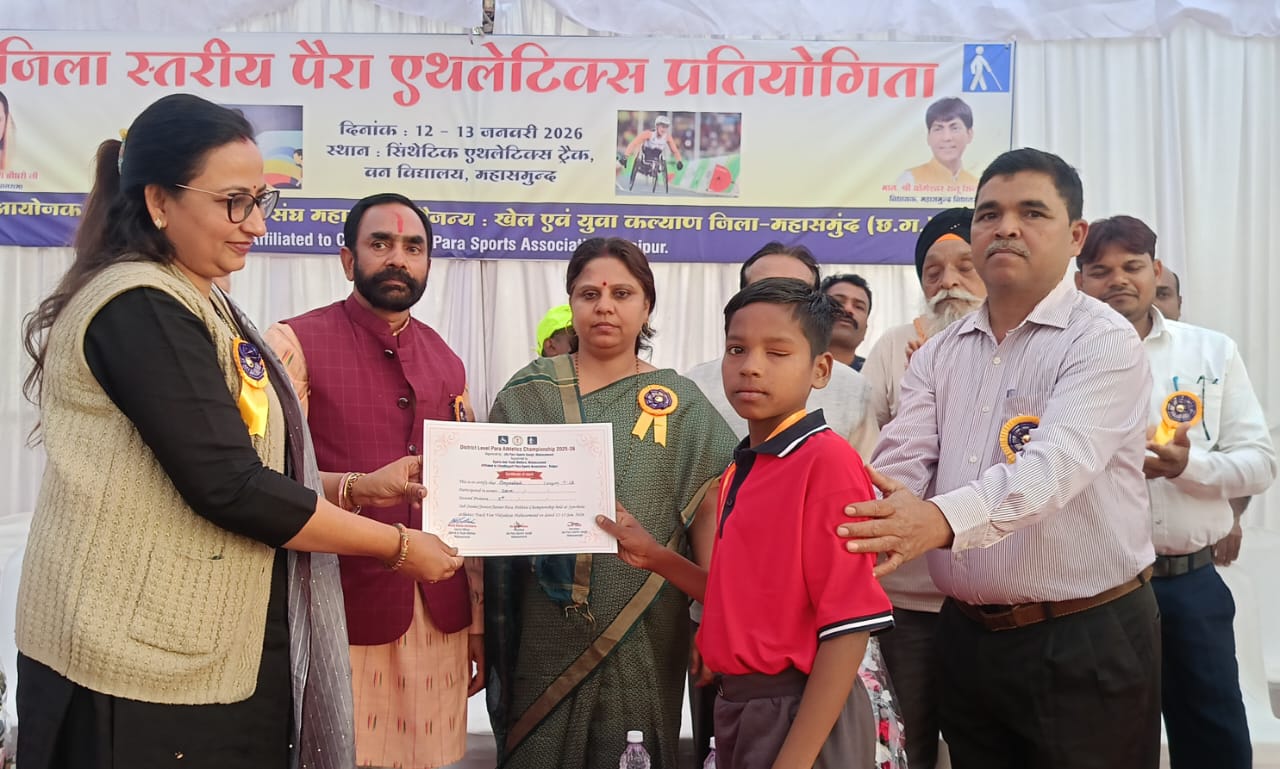 महासमुंद – जिला पैरा स्पोर्ट्स संघ महासमुंद, छत्तीसगढ़ पैरा स्पोर्ट्स एसोसिएशन रायपुर द्वारा खेल एवं युवा कल्याण महासमुंद के सहयोग एवं मार्गदर्शन में जिला स्तरीय पैरा एथलेटिक्स प्रतियोगिता का आयोजन दिनांक 12 से 13 जनवरी 2026 तक सिंथेटिक एथलेटिक्स ट्रैक वन विभाग महासमुंद में आयोजित किया गया। उद्घाटन समारोह में मुख्य अतिथि विधायक महासमुंद योगेश्वर राजू सिंहा, जिलाध्यक्ष येतराम साहू, नगर पालिका उपाध्यक्ष देवीचंद राठी, आनंद साहू, महेंद्र सिक्का, पवन पटेल, संदीप घोष, राहुल चंद्राकर, विपिन बिहारी महंती, अपूर्व पांडे, सविता महंती, अनीता निर्मलकर, रवि जैन, आकाश पांडे, शरद राव, अनीश बग्गा, राजू चंद्राकर, धर्मेंद्र महोबिया आदि की उपस्थिति में मां सरस्वती एवं स्वामी विवेकानंद जी के तैलचित्र पर माल्यार्पण एवं दीप प्रज्ज्वलित कर किया गया। समापन समारोह में मुख्य अतिथि माननीय सांसद महासमुंद रूप कुमारी चौधरी, जिला अध्यक्ष येतराम साहू, आनंद साहू, विपिन बिहारी महंती, डिकेश टंडन, सविता महंती, अंतर्राष्ट्रीय पैरा एथलेटिक्स खिलाड़ी ईश्वरी निषाद, नरेश चंद्राकर, अपूर्व पांडे, लक्ष्मी चंद्राकर, अंकित लूनिया, गुरु बच्चन सिंह आदि उपस्थित रहे। सांसद रूप कुमारी चौधरी ने अंतरराष्ट्रीय बॉल बैडमिंटन श्रृंखला नेपाल में स्वर्ण पदक जीतने वाली बेमचा की लक्ष्मी चंद्राकर पिता नरेश चंद्राकर को प्रमाण पत्र, ट्रॉफी प्रदाय कर सम्मानित कर उज्जवल भविष्य के लिए बधाई एवं शुभकामनाएं दीं। उन्होंने कहा खिलाड़ियों को उनके हुनर को सामने लाने, लगातार प्रयास करते रहने, बेहतर संसाधन एवं सुविधा प्रदान करने आश्वासन दिया। भाग लेने वाले सभी खिलाड़ियों को शुभकामनाएं एवं बधाई दीं। सभी विजेता खिलाड़ियों को मेडल, प्रमाण प्रदाय कर पुरस्कृत किया गया। पैरा एथलेटिक्स प्रतियोगिता के परिणाम इस प्रकार है – सब – जूनियर बालक वर्ग में के टी 12 कैटेगरी में 100 मीटर दौड़ में केशव ने प्रथम स्थान, रोशन दास ने द्वितीय स्थान प्राप्त किया। सब – जूनियर बालक टी 46 कैटेगरी के गोला फेंक में कुशल निषाद ने प्रथम स्थान प्राप्त किया। सब – जूनियर लंबीकूद बालिका टी 11 कैटेगरी में कुसुम प्रधान ने प्रथम स्थान प्राप्त किया। सब – जूनियर गोला फेंक टी 12 कैटेगरी में रोशन दास ने प्रथम एवं टी 11 कैटेगरी में भागीरथी ने प्रथम स्थान प्राप्त किया। जूनियर टी 12 कैटेगरी में ज्योति निषाद ने प्रथम स्थान प्राप्त किया। 400 मीटर दौड़ में सोनम ने प्रथम स्थान प्राप्त किया। बालक 400 मीटर दौड़ टी 12 कैटेगरी में नोसन पटेल ने प्रथम स्थान प्राप्त किया। सब – जूनियर बालक टी 11 कैटेगरी के 100 मीटर दौड़ एवं 200 मीटर दौड़ में प्रथम स्थान यखिल दीवान एवं सूरज भोई ने द्वितीय स्थान प्राप्त किय