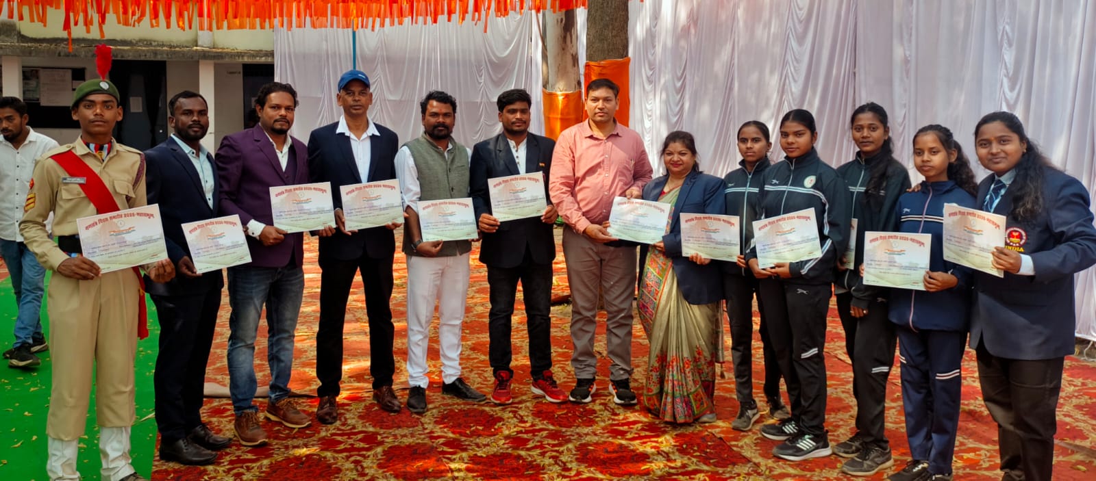 महासमुंद – 26 जनवरी – 77 वें गणतंत्र दिवस के अवसर पर जिला प्रशासन द्वारा स्थानीय मिनी स्टेडियम महासमुंद में आयोजित मुख्य समारोह में खेल एवं युवा कल्याण महासमुंद द्वारा खेल के क्षेत्र में उत्कृष्ट कार्य करने वाले खिलाड़ियों एवं प्रशिक्षकों के उल्लेखनीय योगदान के लिए मुख्य अतिथि रूप कुमारी चौधरी के द्वारा प्रशस्ति पत्र देकर सम्मानित किया गया। खेल विभाग की अनुशंसा पर सम्मानित होने वाले खिलाड़ियों एवं प्रशिक्षकों में डॉ. सुनील कुमार भोई, अंजनी साहू, आनंद वैष्णव, सेवन दास मानिकपुरी, तारिणी साहू, आदित्य पटेल, योजना रंगारी, निमेष मन्नाडे, अभिषेक नेहरू, मुस्कान निषाद, केशव साहू, बॉल बैडमिंटन खेल में लक्ष्मी चंद्राकर अंतरराष्ट्रीय चैंपियनशिप में भागीदारी एवं पदक जीतने पर सम्मानित, दामिनी वर्मा, सविता जोशी, गीतांजलि साहू, हैंडबॉल खेल में आदित्य चंद्राकर, सुमित सिंह रामगढ़िया को 54 वीं सीनियर नेशनल हैंडबॉल चैंपियनशिप वेस्ट बंगाल में कांस्य पदक जीतने पर सम्मानित किया गया। सम्मानित खिलाड़ियों एवं प्रशिक्षकों को विधायक योगेश्वर राजू सिंहा, कलेक्टर विनय कुमार लंगेह, पुलिस अधीक्षक प्रभात कुमार, सीईओ हेमंत रमेश नंदनवार, अपर कलेक्टर सचिन भूतड़ा, शिक्षा अधिकारी विजय कुमार लहरें, खेल अधिकारी खेल एवं युवा कल्याण मनोज धृतलहरे, दिलीप लहरे, अंजली बरमाल, प्राचार्य भोरिंग कमलेश्वरी साहू, प्राचार्य बेमचा एस एल पाटकर, प्राचार्य स्वामी आत्मानंद हिंदी मीडियम स्कूल महासमुंद हेमेंद्र आचार्य, इमरान अली, नूरेन चंद्राकर, अंकित लूनिया व अन्य खेल संघों के पदाधिकारियों व खिलाड़ियों, व्यायाम शिक्षकों ने बधाई एवं शुभकामनाएं दीं।