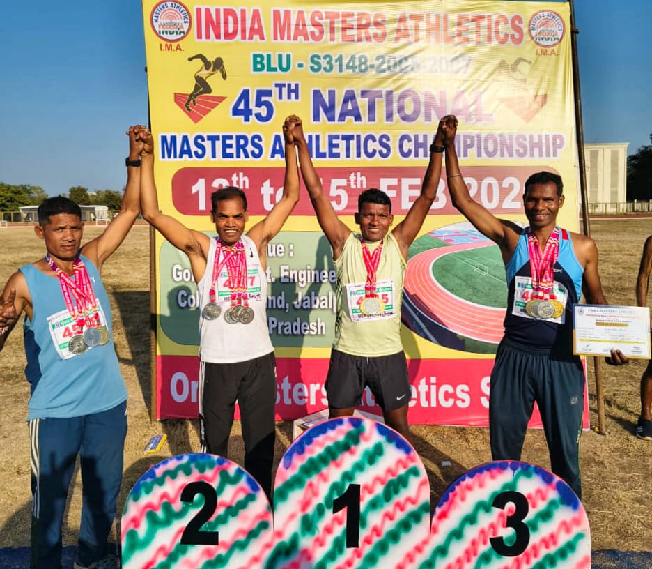 महासमुन्द – 45 वीं नेशनल मास्टर एथलेटिक्स चैंपियनशिप का आयोजन दिनांक 13 से 15 फरवरी 2026 तक जबलपुर, मध्य प्रदेश में आयोजित किया गया। जिसमें भारत के सभी राज्यों से लगभग 1426 एथलीटों ने भाग लिया। छत्तीसगढ़ की टीम भी चैंपियनशिप में शामिल रहीं। छत्तीसगढ़ टीम में महासमुंद जिले से 04 खिलाड़ियों ने भाग लिया, जिसमें महासमुंद से पुरुष वर्ग में आरक्षक महासमुंद से साधुराम ध्रुव, सहायक शिक्षक बांजीपुर से जनक राम ध्रुव, सहायक शिक्षक बागबाहरा से दौलत राम दीवान एवं महिला वर्ग में प्रधान पाठक आमापारा मुनगाशेर से रामबती ठाकुर शामिल हुए। साधुराम ध्रुव ने 800 मी. दौड़ में सिल्वर मेडल, 400 मीटर हर्डल में गोल्ड मेडल, 4×100 मीटर रिले रेस में सिल्वर मेडल एवं 4×400 मीटर रिले रेस में सिल्वर मेडल प्राप्त किया। साधुराम ध्रुव ने 01 स्वर्ण पदक एवं 03 रजत पदक जीतने में सफलता हासिल किया। जनक राम ध्रुव ने 100 मीटर दौड़ में गोल्ड मेडल, लंबीकूद में गोल्ड मेडल, 400 मीटर दौड़ में सिल्वर मेडल एवं 4×400 मीटर रिले रेस में सिल्वर मेडल प्राप्त किया। जनक राम ध्रुव ने 02 स्वर्ण पदक एवं 02 रजत पदक जीतने में सफलता हासिल किया। दौलत राम दीवान ने 5000 मीटर दौड़ में गोल्ड मेडल,1500 मीटर दौड़ में गोल्ड मेडल एवं 4×400 मीटर रिले रेस में सिल्वर मेडल प्राप्त किया। दौलत राम दीवान ने 02 स्वर्ण पदक एवं 01 रजत पदक जीतने में सफलता हासिल किया। रामबती ठाकुर ने 100 मीटर दौड़ में गोल्ड मेडल, 80 मीटर हर्डल में गोल्ड मेडल एवं लंबीकूद में सिल्वर मेडल जीता। रामबती ठाकुर ने 02 स्वर्ण पदक एवं 01 रजत पदक जीतने में सफलता हासिल किया। इस प्रकार छत्तीसगढ़ राज्य दल में 42 एथलीटों ने 21 स्वर्ण पदक, 28 रजत पदक एवं 19 कांस्य पदक सहित कुल 68 पदक जीतकर छत्तीसगढ़ का नाम पूरे भारत में रौशन किया। खिलाड़ियों की उपलब्धियों पर कलेक्टर विनय कुमार लंगेह, पुलिस अधीक्षक प्रभात कुमार, खेल अधिकारी खेल एवं युवा कल्याण महासमुंद मनोज धृतलहरे, विद्यालय प्राचार्य एवं स्टॉफ एवं खिलाड़ियों ने बधाई एवं शुभकामनाएं दीं।