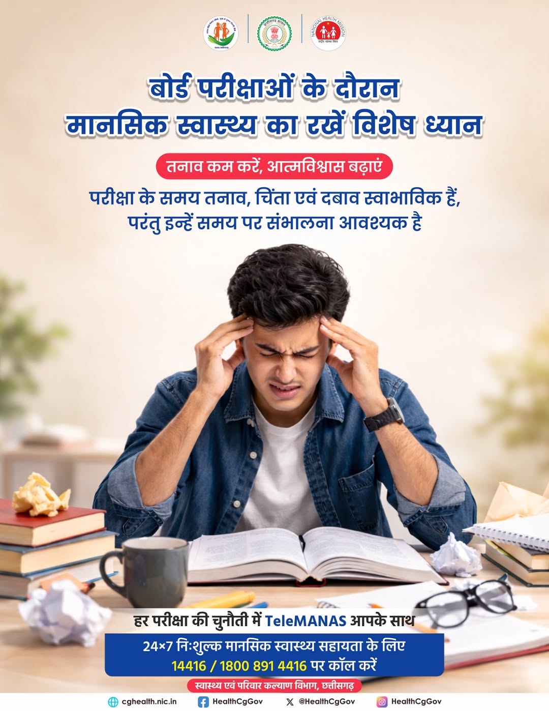 महासमुंद, दिनांक _21 /02/2026__स्वास्थ्य एवं परिवार कल्याण विभाग द्वारा संचालित *राष्ट्रीय मानसिक स्वास्थ्य कार्यक्रम (NMHP)* के अंतर्गत विद्यार्थियों में परीक्षा के समय बढ़ते मानसिक तनाव, चिंता एवं अवसाद की समस्याओं को ध्यान में रखते हुए 24×7 टेली-मानस हेल्पलाइन 14416 प्रारंभ की गई है। इस हेल्पलाइन के माध्यम से छात्र-छात्राओं, अभिभावकों एवं शिक्षकों को विशेषज्ञों द्वारा निःशुल्क परामर्श एवं मार्गदर्शन प्रदान किया जा रहा है।