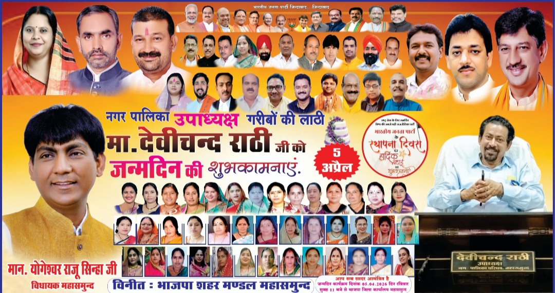 महासमुन्द नगर पालिका उपाध्यक्ष देवीचन्द राठी के जन्मदिन कार्यक्रम का आयोजन भाजपा जिला कार्यालय बी० टी० आई रोड महासमुन्द में 5 अप्रेल रविवार दोपहर 12 बजे से होगा उक्त जानकारी भाजपा शहर मण्डल अध्यक्ष महेन्द् शिका ने देते हुये शुभचिन्तको नेताओ कार्यकर्ताओं सें कार्यक्रम में शामिल होने की अपील की है