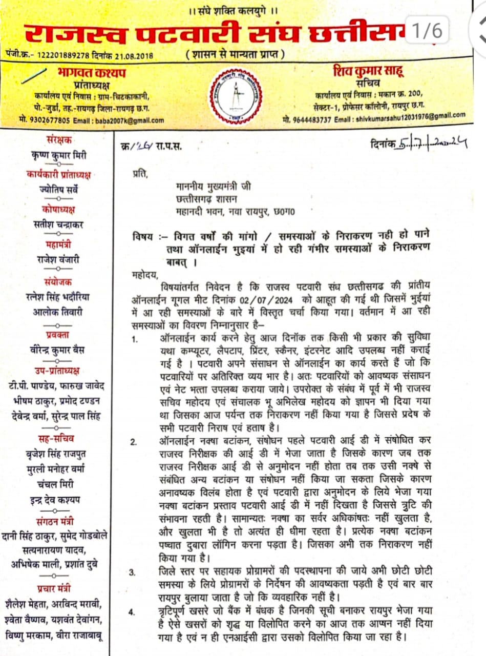 समस्त छत्तीसगढ़ के पटवारियों द्वारा 37 बिंदु में अपनी समस्यों को लेकर राजस्व पटवारी संघ छत्तीसगढ़ के प्रांताध्यक्ष भागवत कश्यप सचिव शिव कुमार साहू एवं संरक्षक कृष्ण कुमार मिरी,कार्यकारी प्रांताध्यक्ष ज्योतिष सर्वे ,कोषा अध्यक्ष सतीश चंद्रकार समस्त छत्तीसगढ़ के पटवारियों द्वारा मुख्यमंत्री छत्तीसगढ़ विष्णु देव साय को पत्र के माध्यम से आवेदन किया कि हमारी जो 37 बिन्दुयो पर मांग की है उनका निराकरण करने की कृपा करें अगर हमारी समस्याओं का निराकरण नही होगा तो उनके द्वारा 8/07/2024 को समस्त छत्तीसगढ़ के पटवारियों द्वारा राजस्व पटवारी संघ छत्तीसगढ़ द्वारा अनिश्चितत कालीन आंदोलन करने के लिए विवश हो जायेगा जिसकी जवाबदारी शासन प्रशासन की होगी।