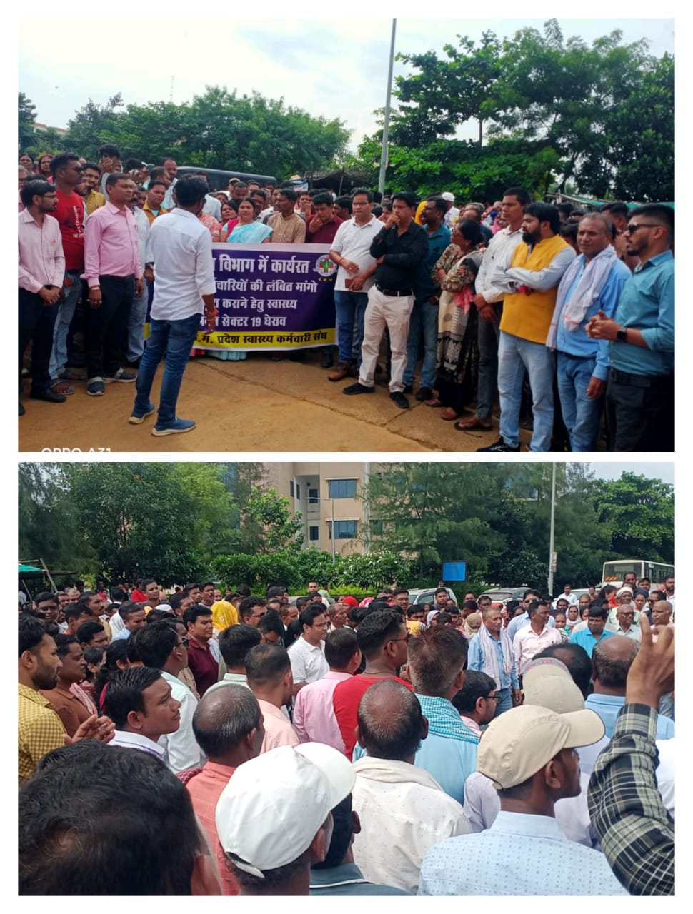 कुंजूरात्रे महासमुंद छत्तीसगढ़ प्रदेश स्वास्थ्य कर्मचारी संघ द्वारा अपने लंबित मांगों के समर्थन में दिनांक 09/09/2024 स्वास्थ्य संचनालय भवन का पुरजोर विरोध करते हुए घेराव किया गया, जिसमें स्वास्थ्य विभाग में किसी भी योजना या मद के अंतर्गत(एन एच एम,जीवन दीप, स्वाशासी,अधिशासी,डी एम एफ,)कार्यरत अनियमित,संविदा, दैनिक वेतन भोगी, मानदेय या आउटसोर्स अधिकारी -कर्मचारियों के लिए बिंदु क्रमांक 01 एवं 05 में उल्लेख मांगों के अनुसार नियमितीकरण, स्थायीकरण,62 वर्ष ज्वाब सुरक्षा,आउटसोर्स पुर्णत बंद,समान काम समान वेतन,27% एवं 4000 रूपये वेतन वृद्धि करने कि मांग को लेकर समस्त स्वास्थ्य केन्द्रो को एक दिवस के लिए बंद करते हुए आंदोलन किया,जिसके विरोध में छत्तीसगढ़ प्रदेश स्वास्थ्य कर्मचारी प्रकोष्ठ संघ सभी अधिकारी कर्मचारियों ने अपनी जायज मांगों के लिए एक दिवस का अवकाश लेकर स्वास्थ्य संचनालय नया रायपुर का घेराव किया गया। जिसमें मुख्य रूप से कर्मचारी संघ के राष्ट्रीय उपाध्यक्ष एवं संरक्षक आदरणीय ओ पी शर्मा जी,प्रान्ताध्यक्ष आदरणीय आलोक मिश्रा जी, प्रांतीय संयोजक एवं प्रदेश अध्यक्ष आदरणीय शुशील कुमार गुप्ता जी के सानिध्य में महासमुंद जिला अध्यक्ष कामिनी चन्द्राकर जी,विनोद महोबिया जी,आत्मा राम साहू जी,भुनेश्वर राव भोसले जी,जितेन्द्र साहु जी,टिकेश यादव जी,ईश्वर राव भोसले जी,संतराम निषाद जी,भुपेंद्र गिरी जी,राज बाई,प्रिती सहिस, गोपाल बुंदेल,लता बुंदेल,रामेश्वर डड्सेना, पुर्णिमा सिंन्हा,मायावती पटेल,योगेन्द्र पंडा,केशी कुमार सहित पुरे प्रदेश के दैनिक वेतनभोगी कलेक्टर दर अनियमित कर्मचारी साढ़े चार हजार की बड़ी संख्या में उपस्थित थे।