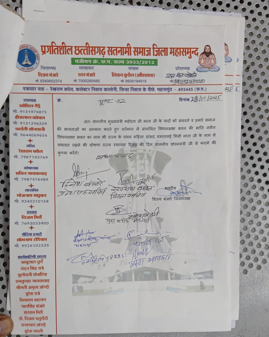 महासमुंद – छत्तीसगढ़ सरकार द्वारा राज्य के नवीन विधानसभा भवन की लोकार्पण देश के यशस्वी प्रधानमंत्री नरेन्द्र मोदी जी के करकमलों से 1 नवंबर को 25 वें राज्य स्थापना दिवस पर करने जा रही है।जिस संबंध में सतनामी समाज ने मुख्यमंत्री छत्तीसगढ़ शासन से नवीन विधानसभा भवन का नाम अविभाजित मध्यप्रदेश के प्रथम महिला सांसद एवं राज्य के महिला सशक्तिकरण की आदर्श महिला ममतामई मिनी माता जी के नाम से पुरानी विधानसभा भवन के नामकरण को यथावत रखने की मांग किया है। चुंकि मिनी माता जी सतनामी समाज के गुरु माता के साथ राज्य की प्रथम महिला सांसद रहीं हैं। जिन्होंने महिला अधिकार व समुचे वंचित समाज के लिए अस्पृश्यता उन्मूलन कानून बनवाने में अहम् भूमिका निभाई। तथा हिन्दू महासभा द्वारा जगतगुरु की पदवी से नवाजे गए एवं सामान्य सीट से सांसद रहे गुरु अगमदास साहेब के अर्धांगिनी रही है। सतनामी समाज देश के विभिन्न राज्यों में निवासरत है।जिसकी आस्था माता जी के प्रति बड़े आदर भाव है। पूरे छत्तीसगढ़ राज्य एवं देश विदेश के लोगों को ज्ञात है कि छ.ग. विधानसभा भवन ममतामयी मिनीमाता के नाम पर संचालित है। PSC तथा विभिन्न प्रकार की प्रतियोगी परीक्षाओं में भी ममतामयी मिनीमाता विधानसभा भवन के नाम पर सवाल पूछे जाते हैं। जो प्रशंसनीय रहा है।
