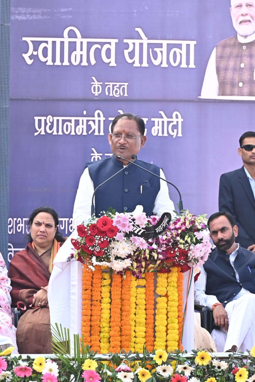 मुख्यमंत्री विष्णुदेव साय ने सभी स्वामित्व कार्ड के लाभार्थियों को बधाई देते हुए कहा कि आज जिले के 128 गांवों के 10850 लाभार्थियों को स्वामित्व कार्ड वितरण किया जा रहा है। प्रधानमंत्री गांव के गरीब और किसान के लिए काम कर रहे हैं। प्रधानमंत्री नरेन्द्र मोदी जी की मंशा और दूरदर्शी सोच के अनुरूप सरकार ने स्वामित्व योजना को प्रभावी रूप से लागू करने के लिए मजबूती से कदम उठाए हैं। यह योजना न केवल एक ऐतिहासिक पहल है, बल्कि ग्रामीण भारत को सशक्त बनाने का माध्यम भी है। मुख्यमंत्री साय ने कहा कि संपत्ति के अधिकार केवल भूमि और अन्य संसाधनों के कानूनी स्वामित्व तक सीमित नहीं हैं, ये व्यक्तियों और समुदायों को आत्मनिर्भरता, स्थिरता और सम्मानित जीवन का आधार प्रदान करते हैं। विशेष रूप से, हमारे समाज के कमजोर और वंचित वर्गों के लिए यह अधिकार उनकी आर्थिक, सामाजिक और व्यक्तिगत स्वतंत्रता सुनिश्चित करता है। भूमि प्रशासन को पारदर्शी और प्रभावी बनाना हमारी प्राथमिकता है। भूमि की सीमाओं का स्पष्ट सीमांकन न केवल विवादों को रोकने में सहायक है, बल्कि सामाजिक स्थिरता और न्याय प्रणाली को सुदृढ़ करता है
