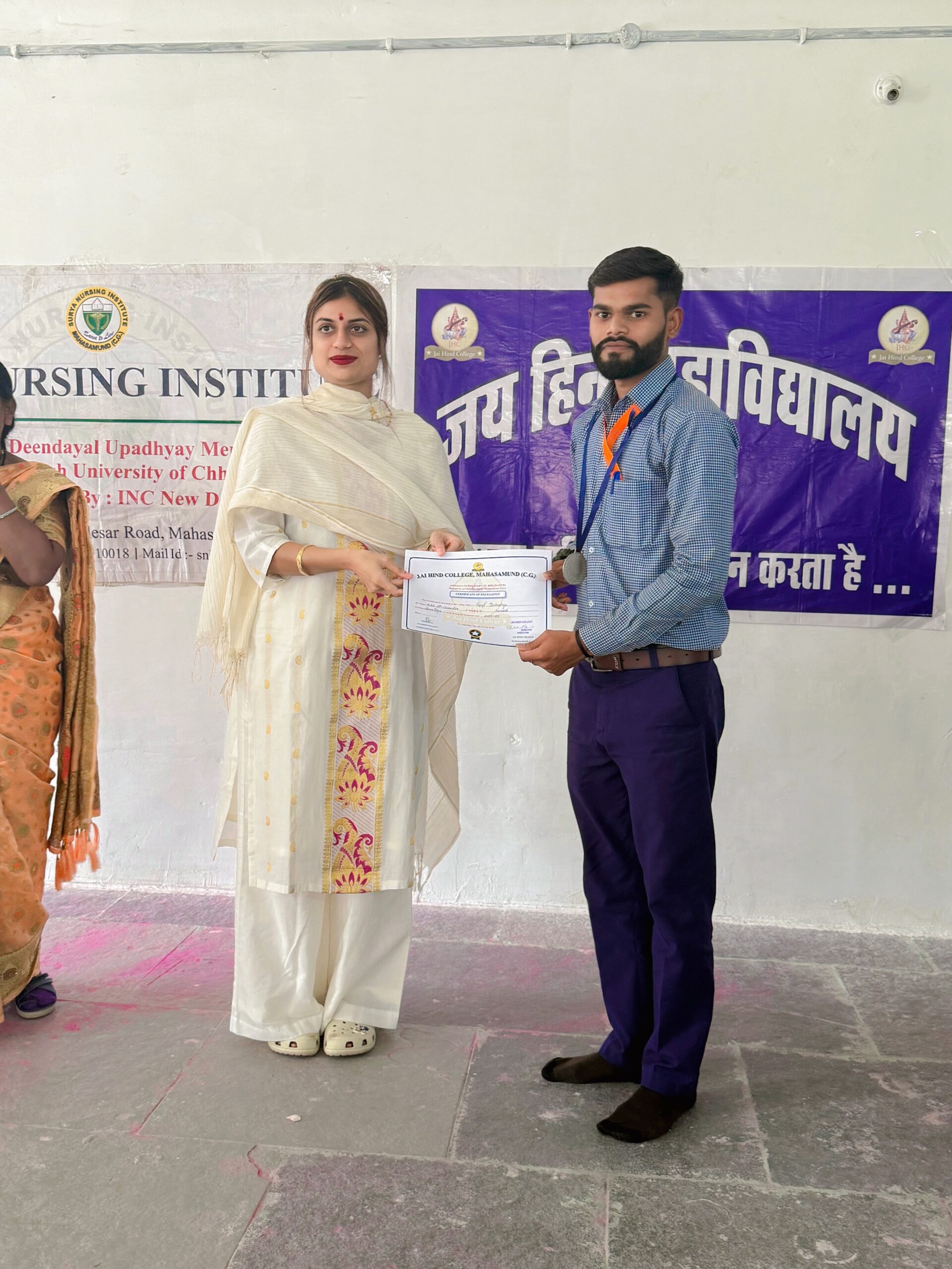 महासमुंद 1 फरवरी 2025/ जय हिन्द कॉलेज महासमुंद में आज सम्मान समारोह का आयोजन किया गया। कार्यक्रम में मुख्य अतिथि के रूप में डॉ. एकता लंगेह शामिल हुए।कार्यक्रम की शुरुआत सरस्वती वंदना एवं स्वागत गीत के साथ हुई। इस अवसर पर डॉ. एकता लंगेह ने छात्र-छात्राओं को संबोधित करते हुए कहा कि किसी भी क्षेत्र में सफलता प्राप्त करने के लिए कठिन परिश्रम आवश्यक है। उन्होंने प्रेरणादायक शब्दों में कहा, “प्रयास करने से आज नहीं तो कल सफलता अवश्य मिलेगी।” उन्होंने आगे कहा कि जो छात्र सफल हुए हैं, वे अत्यधिक खुश न हों और जो असफल रहे हैं, वे निराश न हों। निरंतर प्रयास करने से सफलता अवश्य प्राप्त होगी।इस अवसर पर सांस्कृतिक कार्यक्रम का भी आयोजन किया गया, जिसमें छत्तीसगढ़ी भाषा पर आधारित गीतों पर नृत्य प्रस्तुत किया गया। मुख्य अतिथि ने इन प्रस्तुतियों की सराहना की और कलाकारों का उत्साहवर्धन किया।समारोह में मेधावी एवं विजयी छात्रों को मेडल एवं शील्ड प्रदान कर सम्मानित किया गया। कार्यक्रम में कॉलेज की प्रचार्य श्रीमती पुष्पलता देशमुख, समस्त शिक्षकगण एवं छात्र-छात्राएं उपस्थि