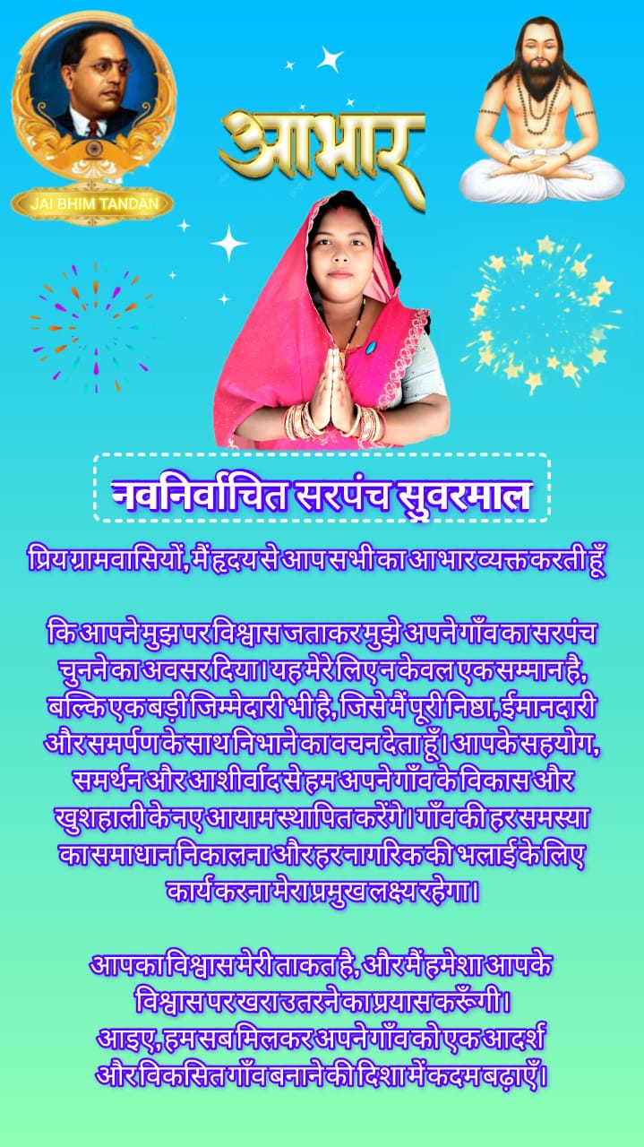 महासमुंद बागबाहरा त्रिकोणीय ग्राम पंचायत सुवरमाल सरपंच पद जीत हासिल किया मारकण्डे आभार ,सरपंच श्रीमती मुक्ता यशवंत मारकण्डे जीते, हासिल किया जबकि सहज, मिलनसार, कर्मठ एवं सुयोग्य महिला प्रत्याशीश्रीमती मुक्ता यश्वंत मारकण्डे को