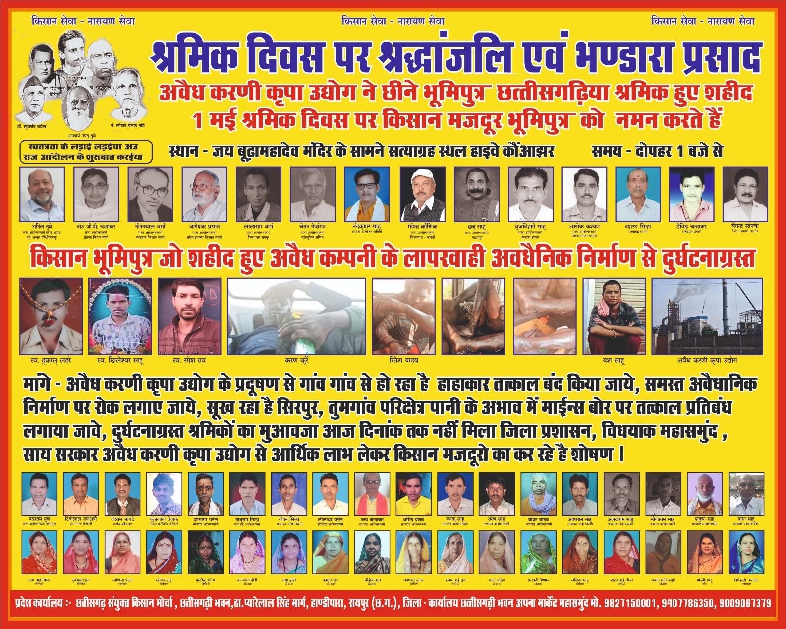 महासमुंद 28 अप्रैल 2025। विश्व धरोहर सिरपुर बचाने संकल्प बद्ध राज्य आंदोलनकारी छत्तीसगढ़ संयुक्त किसान मोर्चा के बैनर तले अवैध करणी कृपा स्टील एवं पावर प्लांट के समस्त अवैधानिक कार्य,औद्योगिक प्रदूषण के विरुद्ध तीन साल से चले आ रहे किसान सत्याग्रह आंदोलन के सत्याग्रह आंदोलनकारीयों द्वारा अवैध करणी कृपा उद्योग में किसान भूमि पुत्र श्रमिक हुए हैं शहीद जिनको श्रमिक दिवस 1 मई 2025 को दोपहर 1 बजे से सत्याग्रह स्थल बूढ़ा महादेव मंदिर के सामने हाईवे कौँवाझर में किया जाएगा स्मरण दिया जाएगा श्रद्धांजलि साथ ही होगा भंडारा। जिसके मुख्य अतिथि राज्य आंदोलनकारी किसान मोर्चा के प्रदेश अध्यक्ष अनिल दुबे होंगे। अध्यक्षता प्रसिद्ध रामायणी कलाकार नंदकुमार साहू करेंगे। विशेष अतिथि के रूप में किसान मोर्चा के संरक्षक दाऊ जी पी चंद्राकर, प्रदेश किसान नेता छन्नूलाल साहू वेगेन्द्र सोनवेर,नव निर्वाचित सरपंच,उप सरपंच,पंचगण।भंडारा दोपहर 1 बजे से प्रारंभ होकर शाम 4 बजे तक चलेगा।उसके पश्चात शाम 4 बजे से किसान भूमि पुत्र श्रमिकों को श्रद्धांजलि दिया जाएगा और आगामी आंदोलन की रणनीति पर कार्ययोजना तैयार किया जाएगा।