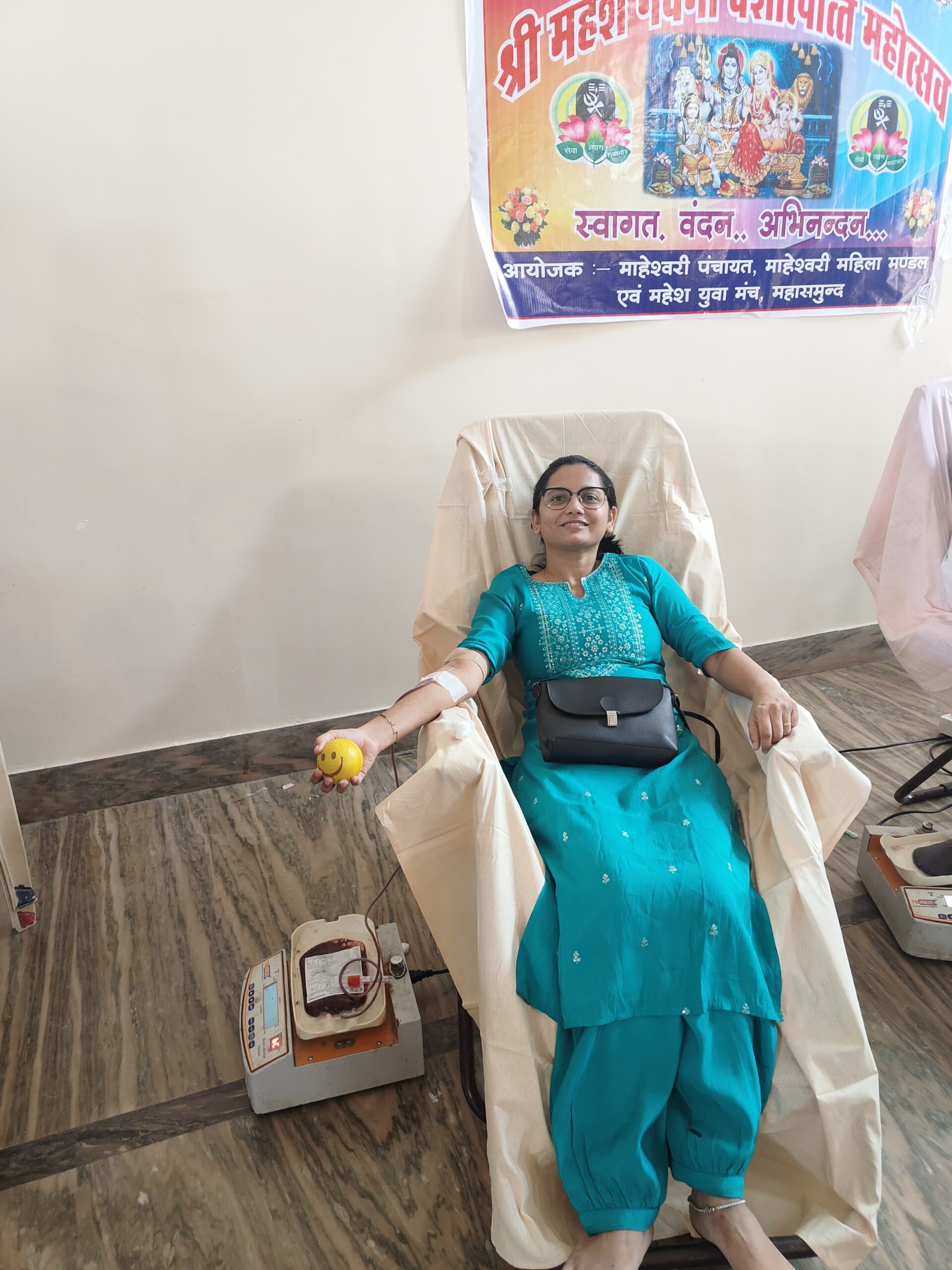 महासमुन्द महेश्वरी समाज की वंशोत्पति दिवस महेश नवमी पर्व पर आयोजित रक्त दान शिविर में आरोग्य चिल्ड्रन हास्पीटल की संचालिका एवं चिल्ड्रन स्पेश्लिस्ट डॉ. योगिता राठी ने श्री शांतीनाथ जैन भवन में रक्तदान किया । तथा और भी समाज जनों को रक्तदान करने के लिए प्रेरित किया