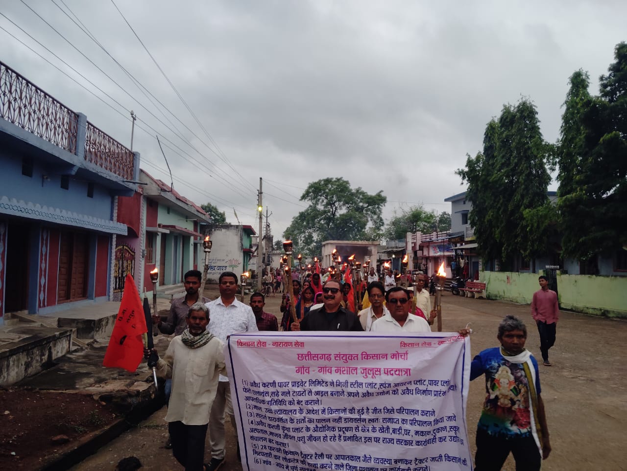 राज्य आंदोलनकारी किसान मोर्चा के प्रदेश अध्यक्ष अनिल दुबे ने मशाल हाथ में देके शुभारंभ किया। मशाल लेके निकले युवा,किसान,महिला किसान श्रीराम जानकी मंदिर परिसर से दुकान चौक,बंगलापारा, नीम चौरा चौक,बजरंग चौक,बाजारचौक, बाजारपारा,बस्तीपारा,सतनामी पारा, साहू पारा, यादव पारा होते हुए श्रीराम जानकी मंदिर परिसर में समापन हुआ।मशाल जुलूस शुभारंभ के पहले उपस्थित सभी ने देश के शहीद वीर जवानों को श्रद्धांजलि दिया ।